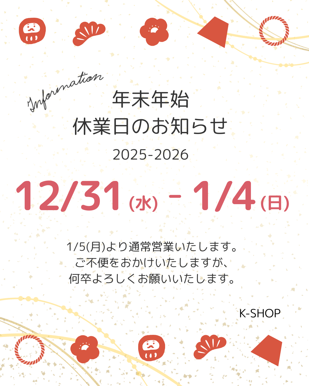 年末年始休業日のお知らせ